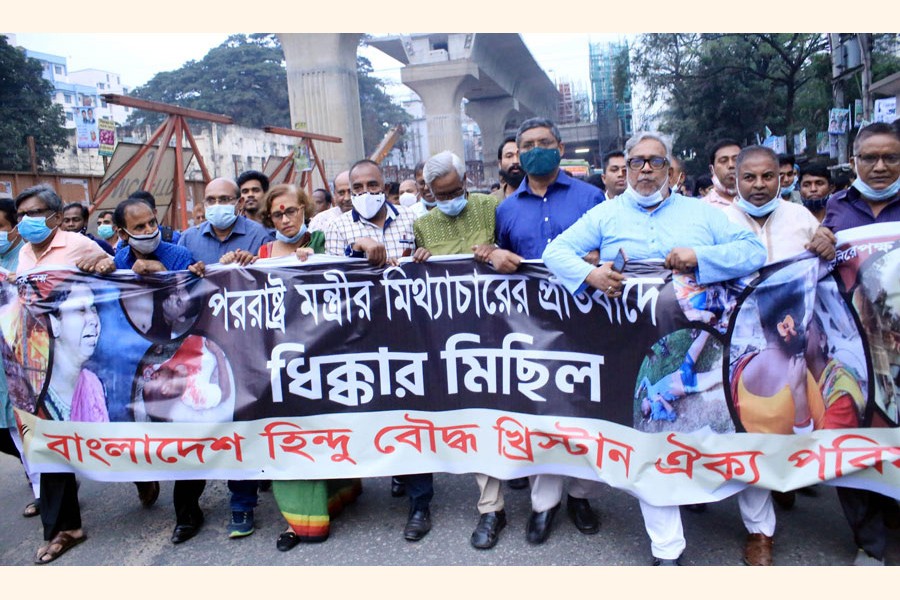 Bangladesh Hindu-Bouddha-Christian Oikya Parishad brings out a procession from the National Press Club in the city on Friday protesting ‘spread of falsehood by Foreign Minister Dr AK Abdul Momen’ — Focus Bangla
