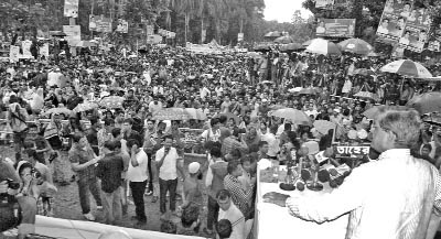 BNP acting secretary general Mirza Fakhrul Islam Alamgir speaking at a meeting organised by the 20-party alliance in the city\'s Suhrawardy Udyan Tuesday. Story on page 1 — FE Photo