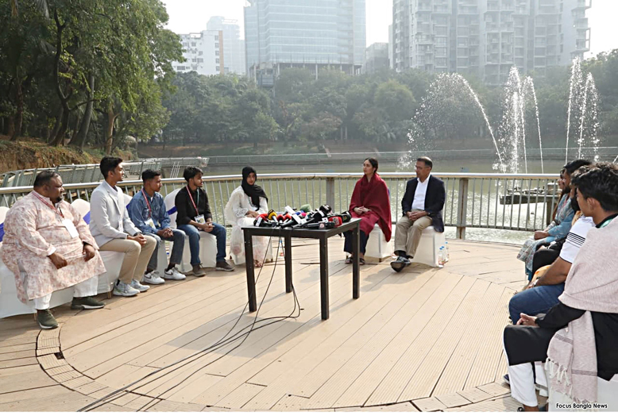 BNP Chairman Tarique Rahman talking with winners of the national reel-making competition, 'My Vision of Bangladesh' organised by the party at the Justice Shahabuddin Park in the capital's Gulshan on Saturday.