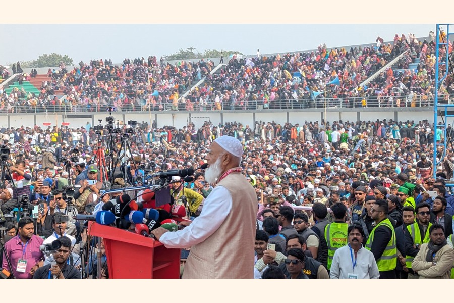 Jamaat-e-Islami Ameer Dr Shafiqur Rahman addressing an election rally at Shaheed Abrar Fahad Stadium in Kushtia on Monday. — Photo Collected