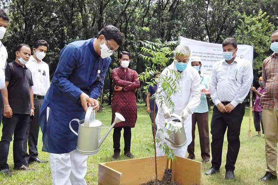 State Minister for Shipping Khalid Mahmud Chowdhury planting a tree on the Jatiya Sangsad Bhaban premises on Tuesday as part of a tree plantation programme organised by Bangladesh Parliament, marking Mujib Borsho, the birth centenary of Father of the Nation Bangabandhu Sheikh Mujibur Rahman — Focus Bangla