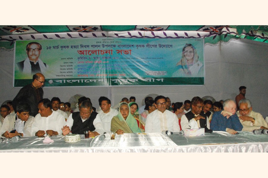 Leaders of ruling party Awami League at a discussion at Bangbandhu Avenue in the city on Friday, organised by Bangladesh Krishak League on the occasion of Krishak Dibas — Focus Bangla