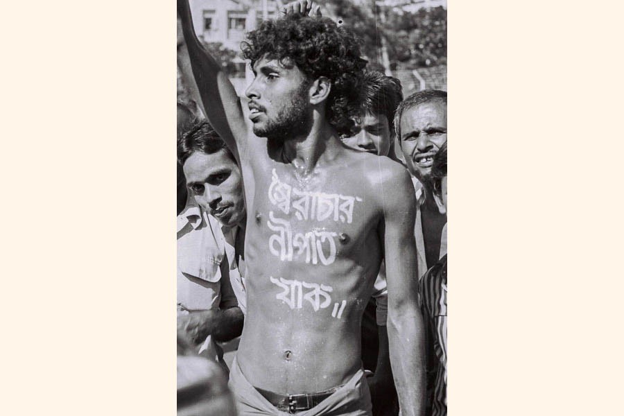 On this day in 1987, Awami Jubo League leader Nur Hossain, who imprinted his bare chest and back with the slogans "Free democracy" and "Down with autocracy", embraced martyrdom in police firing during an anti-autocracy demonstration at Zero Point in the city, now known as Shaheed Nur Hossain Square.