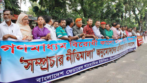 Members of a faction of Bangladesh Federal Union of Journalists (BFUJ) and Dhaka Union of Journalists (DUJ) formed a human chain in front of the National Press Club in the city Saturday protesting against the new broadcasting policy-2014. — Focus Bangla