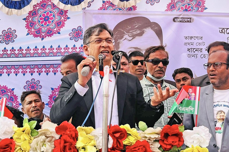 Salahuddin Ahmed, BNP Standing Committee Member and the party candidate for Cox's Bazar-1 constituency, speaking at an election rally at Chokoria in Cox's Bazar on Thursday. — Focus Bangla