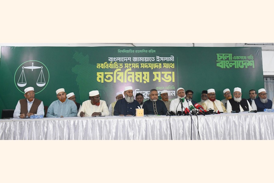 Bangladesh Jamaat-e-Islami Ameer Shafiqur Rahman speaking at a view-exchange meeting with the party's newly-elected lawmakers at Al-Falah Auditorium in the capital's Mogbazar area on Monday. — Collected
