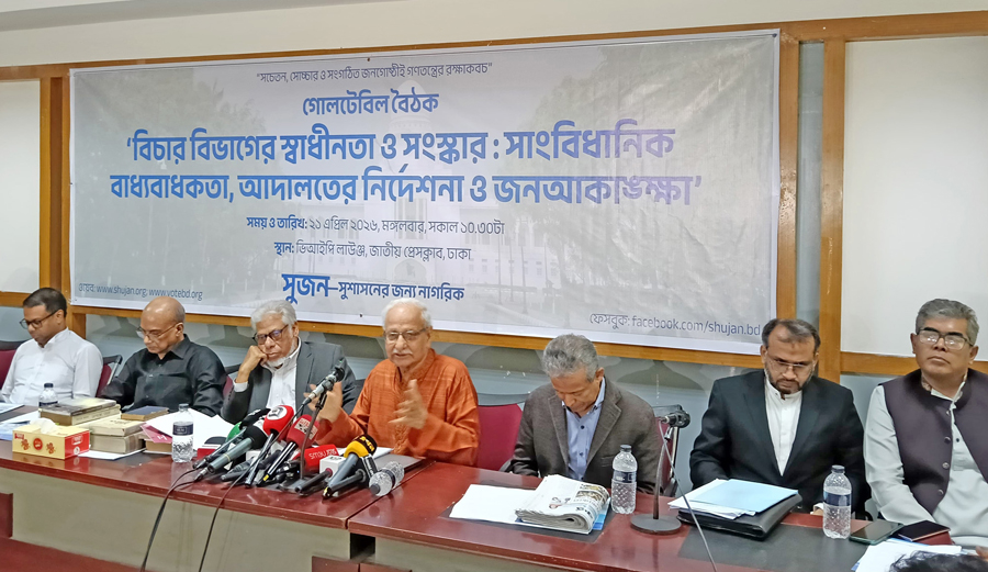 Shushashoner Jonno Nagorik (SHUJAN) Secretary Dr. Badiul Alam Majumdar speaking at a discussion, titled 'Judicial Independence and Reform: Constitutional Obligations, Court Directives and Public Expectations', at the Jatiya Press Club in the capital on Tuesday. — Focus Bangla
