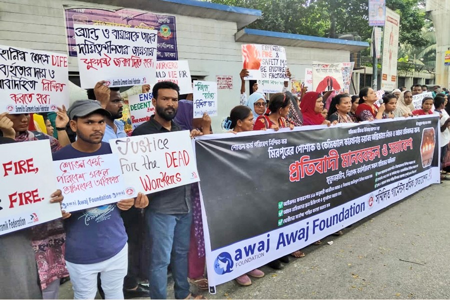 Sommilito Garments Sromik Federation formed a human-chain in front of the National Press Club in the capital on Friday to protest the loss of lives and injury of a number of workers in the Mirpur factory fire on Tuesday. — FE Photo