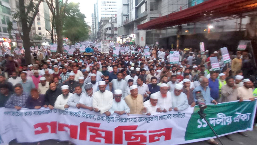 The 11-party alliance led by Bangladesh Jamaat-e-Islami brings out a mass procession from the city's Bijoynagar area on Saturday, demanding implementation of the national referendum and an immediate solution to the fuel crisis and price hike of essentials. — Photo collected