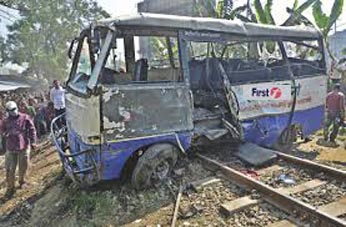 At least 10 people were killed and 30 others injured as a train rammed a bus in Kaliganj upazila in Jhenidah district on Friday. The deceased could not be identified immediately. Kaliganj police said the Khulna-bound ‘Simanto Express’ train from Jessore rammed the bus carrying a bridal party on Barobazar Level Crossing around 3:40am, leaving nine passengers of the bus dead on the spot. One of the injured passengers died at the upazila health complex. The other injured passengers were admitted to Jhenidah Sadar Hospital and Jessore General Hospital. Rail communications between Khulna and other parts of the country came to halt following the accident, according to a news agency.
