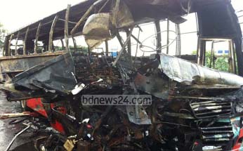 NARSINGDI: At least ten people were killed and 58 others injured as two buses caught fire after a collision on Dhaka-Sylhet highway at Amtala in Shibpur upazila Wednesday afternoon.