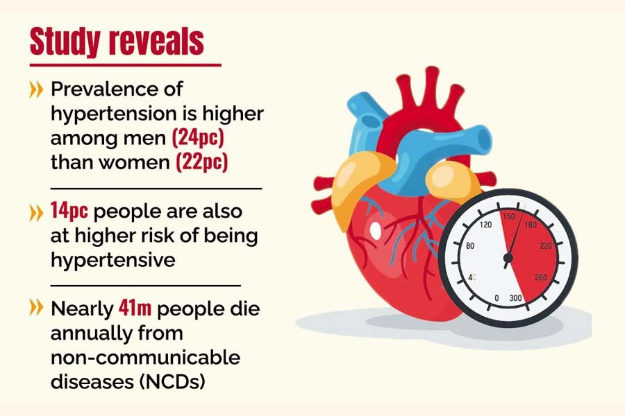 The findings of the study styled 'Hypertension and Obesity Load in Bangladesh: How Large is the Iceberg?' were disclosed at a scientific seminar at a city hotel on Thursday. The prevalence of hypertension is higher among men (24 per cent) than women (22 per cent), says the study.
