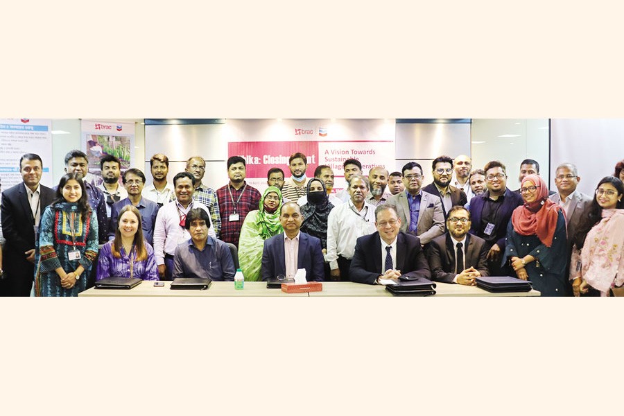 A closing event of the Jibika project, a collaboration between Chevron and BRAC, was held recently at BRAC Centre, Dhaka. Representatives of GoB, BRAC, Chevron, BRAC USA, IDEA, IDE and Sharbik Gram Unnoyon Shomobay Shomiti Ltd. were present. Rear Admiral M Makbul Hossain, Director, Operations, BRAC, attended. Md Ahsan Kabir, Additional Registrar, Department of Co-operatives, Ministry of LGRD & Co-operatives, Eric M. Walker, President, Chevron Bangladesh, Muhammad Imrul Kabir, Director, Corporate Affairs, Chevron Bangladesh, and Lauren Godfrey, Senior Manager of Education, BRAC USA, attended as the Guests of Honour.