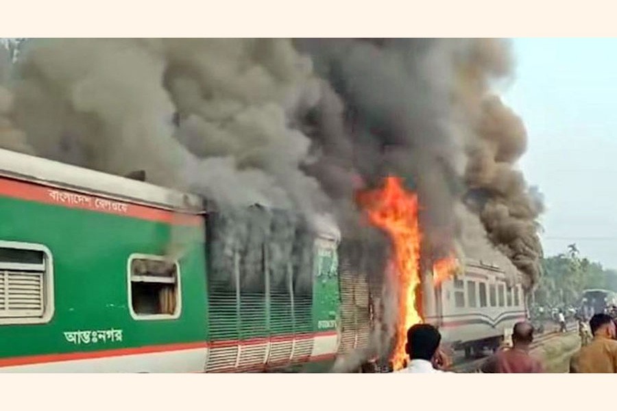 A large fire breaks out in the power car of the Dhaka-bound Chattala Express train at the Bangladesh Military Academy gate area in Chattogram's Bhatiari on Thursday. — Focus Bangla