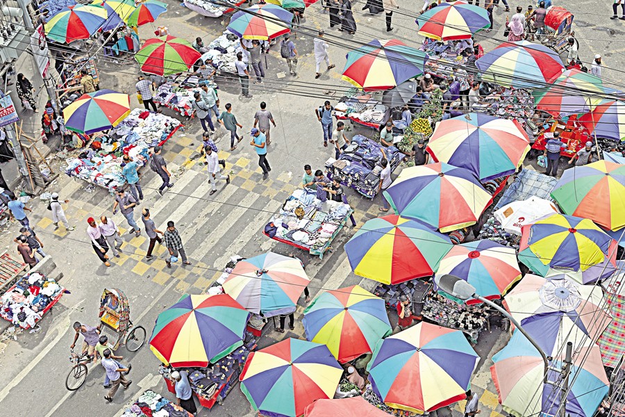 A large number of makeshift shops have long been doing brisk businesses by grabbing the busy main roads and footpaths in the capital's Gulistan area, impeding vehicular movements and causing serious inconvenience to the pedestrians. The snapshot was taken on Monday. — FE Photo