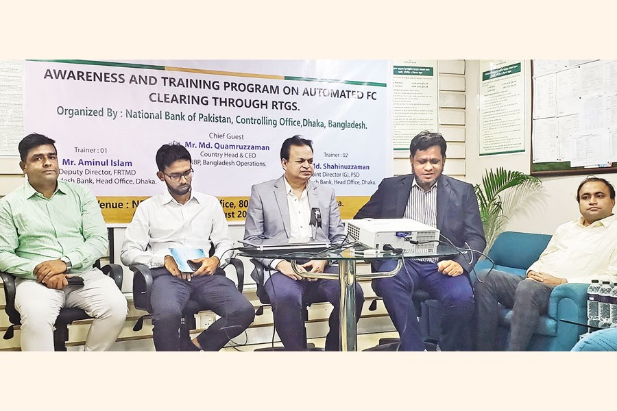 A training programme on "Automated FC Clearing Through RTGS" was held at the National Bank of Pakistan (NBP) controlling office in the city recently. The session was conducted by Md Shahinuzzaman, joint director (G), PSD, and Aminul Islam, deputy director, FRTMD, from Bangladesh Bank. Md Quamruzzaman, country head and CEO of NBP (Bangladesh Operations), was present at the training session