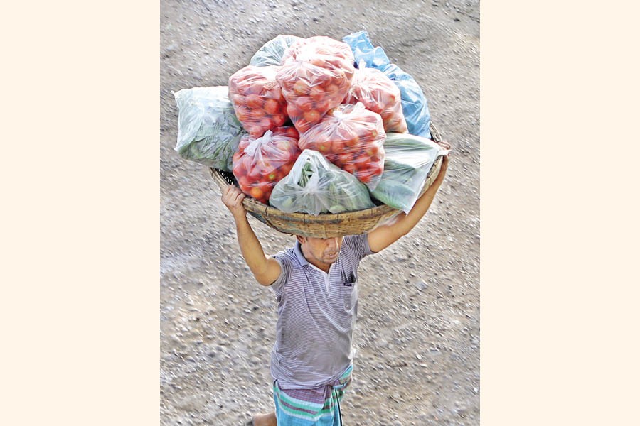 A worker carries vegetables, all packed in plastic bags, after buying them from a wholesale market at Jatrabari in the city on Friday. Although a ban on plastic bags remains in place, their use continues to rise in the country, leading to a higher level of plastic pollution — FE photo by Shafiqul Alam