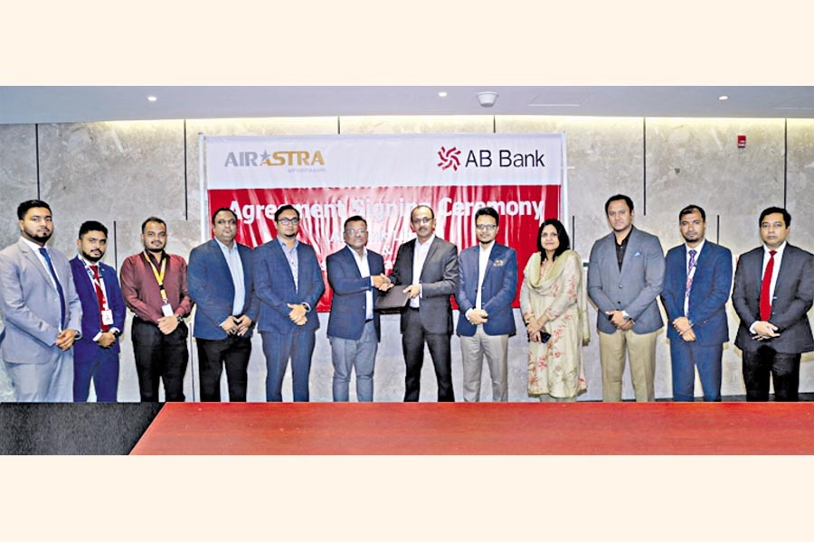 AB Bank Limited inked a memorandum of understanding with Air Astra under which AB Bank cardholders will enjoy a 10 per cent discount on base airfares on domestic routes. Syed Mizanur Rahman, deputy managing director, AB Bank, and Mohammad Mozammel Haque Bhuiya, Air Astra, signed the agreement.