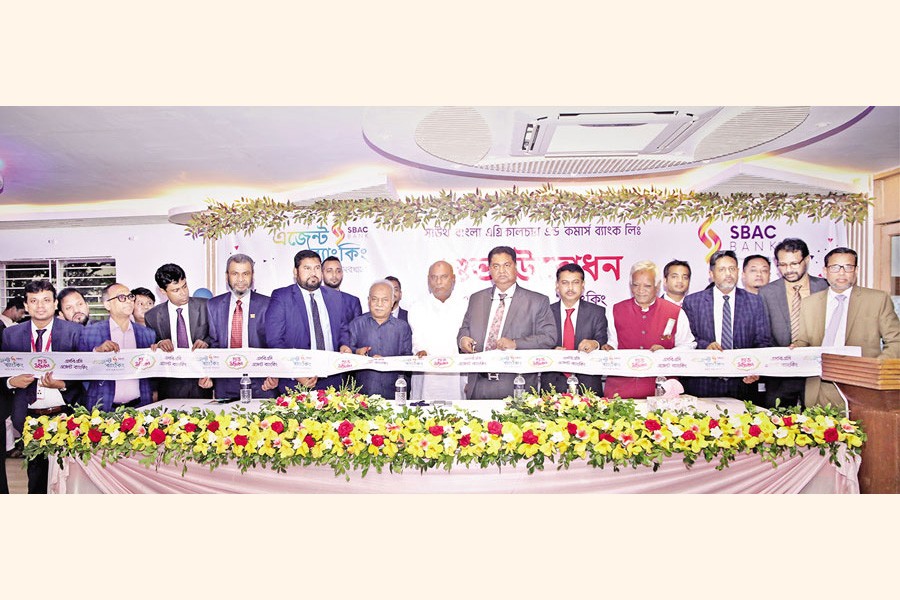 Abdul Kadir Molla, Chairman of South Bangla Agriculture and Commerce Bank Ltd., inaugurated an agent banking outlet at Narsingdi Plaza of Satirpara in Narsingdi on Wednesday. Managing Director and CEO Mosleh Uddin Ahmed presided over the ceremony attended by high officials of the bank