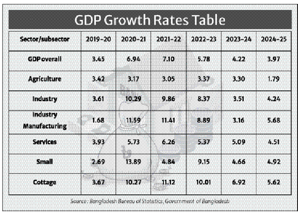 Regarding GDP data, it may be stated that overall GDP is constantly growing but growth rate is on the decrease. Negative growth rates indicate decrease in production and the data presented here show no negative trends of GDP growth. Sectoral analysis reveals that over the last five years, industry and services grew at a decreasing rate. Borrowers of these sectors cannot argue that they experienced fall in production and income. The same applies to small and cottage industry. This macro scenario hints that borrowers' repayment capacity or ability had not decreased as a whole , rather grew at a deceasing rate. The Non-performing loan ( NPL) ratio of 36 per cent is not compatible with the trends of GDP growth rates . Repayment inability may prevail in a very limited scale but is not applicable to all defaulters.
