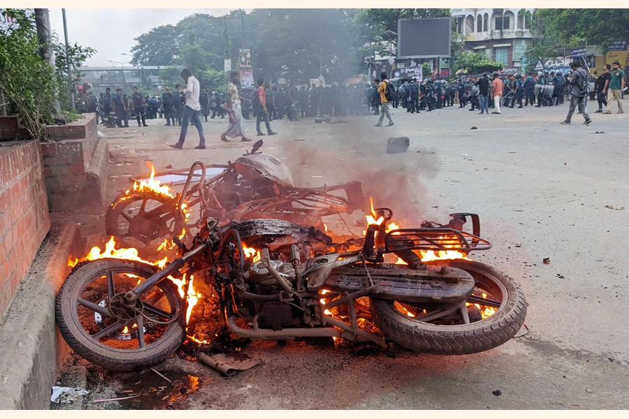 Activists of Jamaat-e-Islami and Islami Chhatra Shibir allegedly set fire to motorcycles during their clashes with the police over the death of war criminal Delawar Hossain Sayedee in the city's Shahbagh area in the early hours of Tuesday — Focus Bangla