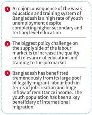 International Migration: Bangladesh has benefitted tremendously from its large pool of legally migrant labour both in terms of job creation and huge inflow of remittance income. The youth population has been a key beneficiary of international migration. Policies relevant to developing the migrant labor force participation, such as training, cost-reduction of migrant labor supply, availability of loans to pay for the migration process, availability of information, as well as policies to ensure labor safety and protection from exploitation will also benefit the youth population.