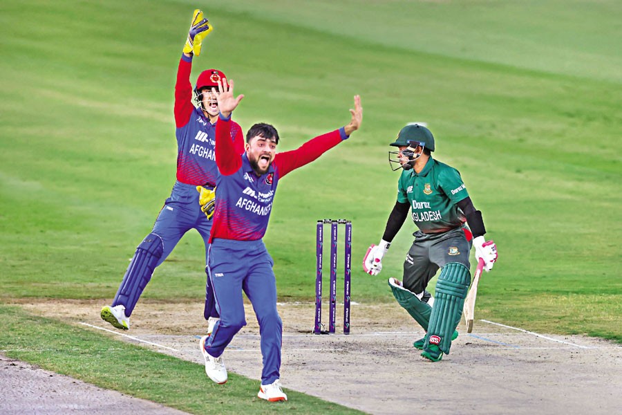 Afghanistan's Rashid Khan (C) successfully appeals for a LBW dismissal against Bangladesh's Mushfiqur Rahim (R) during the Asia Cup Twenty20 international cricket Group B match in Sharjah on Tuesday. Bangladesh scored 127 for 7. Chasing the target, Afghans were batting on 46/2 from 9.4 overs. — AFP