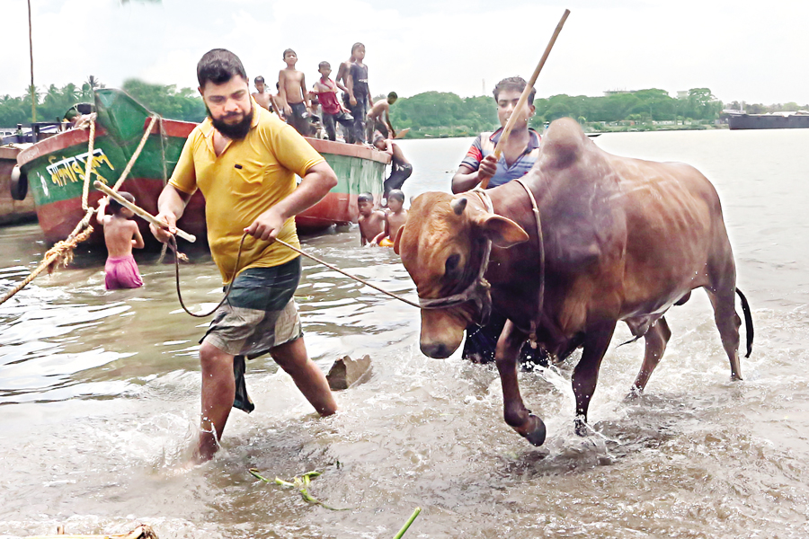 After washing his cow in the Buriganga river near Postogola Shamshan Ghat in the city on Saturday,