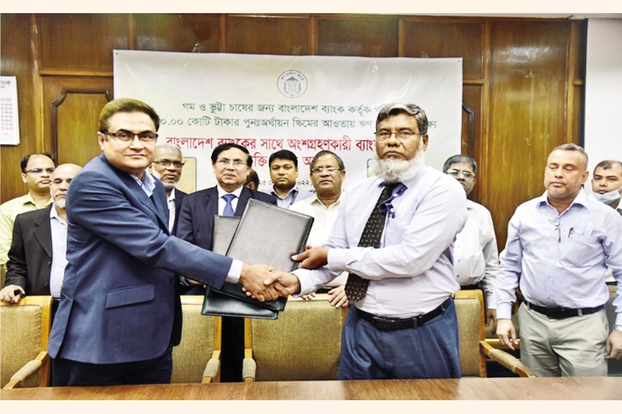 Agrani Bank Limited Managing Director and CEO Md Murshedul Kabir and Bangladesh Bank Agriculture Credit Department Director Md Abul Kalam Azad exchanging documents after signing the agreement on behalf of their respective organisations at Bangladesh Bank conference room on Sunday. Under the refinancing scheme, BB will distribute Tk 10 billion (1,000 crore) in its own source and participatory schedule banks will be implementing to disburse the fund to the farmers