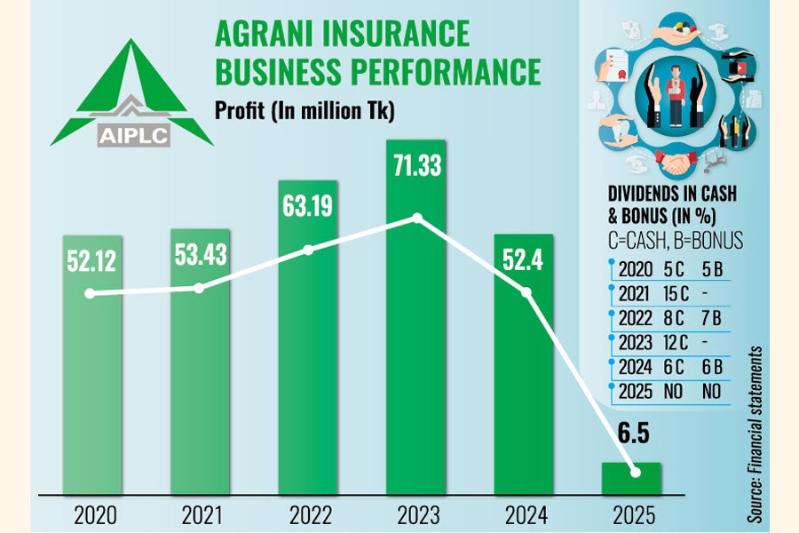 Agrani Insurance Company has reported a profit of Tk 6.5 million in 2025, lowest since its stock market listing, owing to lower premium income and higher claim settlement costs amid a challenging business environment.