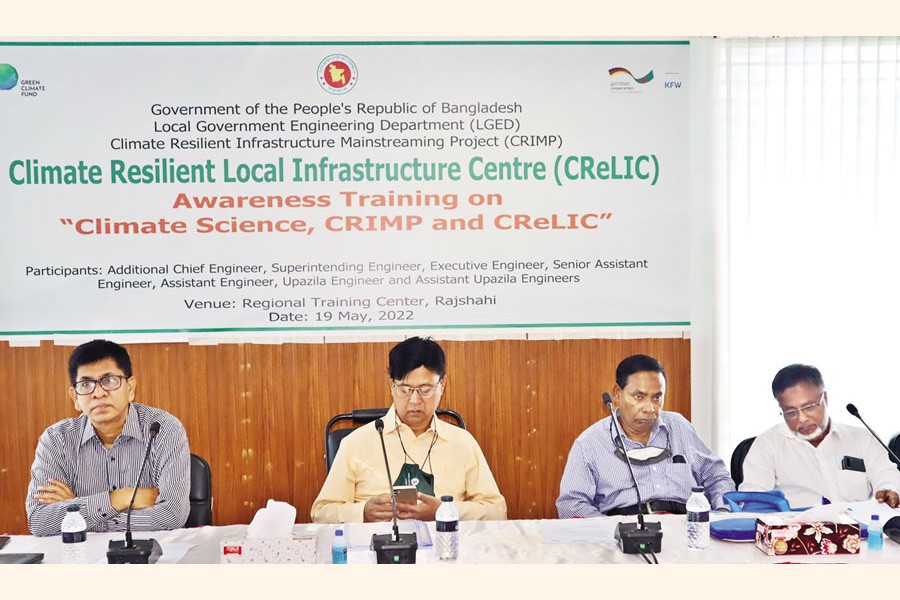 Additional Chief Engineer of Local Government Engineering Department (LGED) AKM Lutfor Rahman inaugurated 'Awareness Training on Climate Science, CRIMP, and CReLIC' at regional training centre of LGED in Rajshahi recently. Superintending Engineer of Bogura region of LGED Md Golam Kabir attended the event as special guest. It was presided over by Superintending Engineer of Rajshahi Division of LGED Md Lutfar Rahman. Project Director of Climate Resilient Infrastructure Mainstreaming Project (CRIMP) Md Jasim Uddin delivered the welcome speech at the climate-awareness training programme