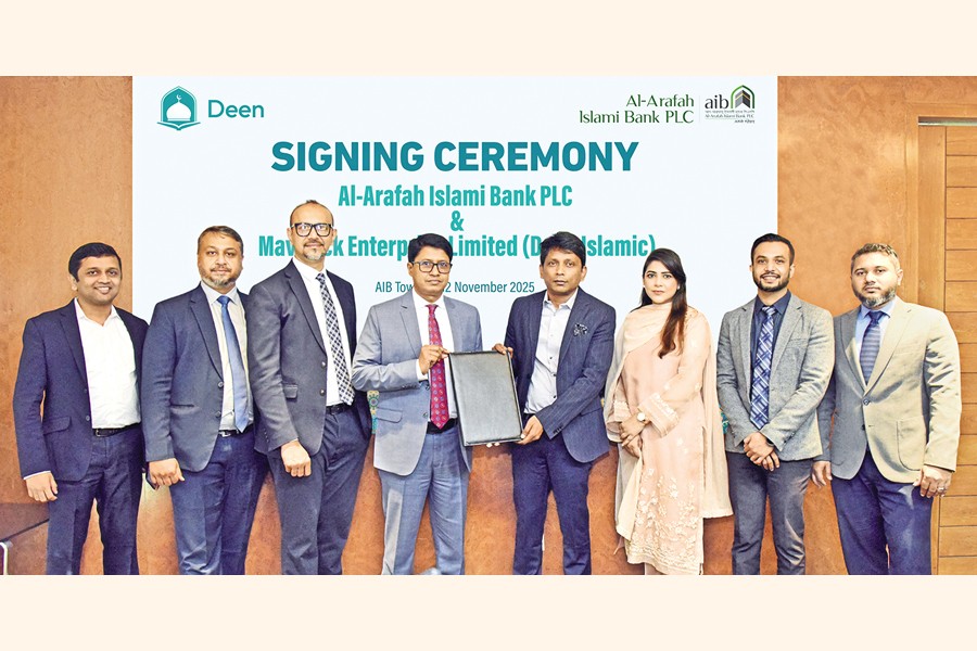 Al-Arafah Islami Bank has signed a strategic partnership agreement with Maverick Enterprise Limited (Deen Islamic), a digital Islamic platform to strengthen Islamic lifestyle solutions and enhance customer convenience. The signing ceremony took place at the bank's head office on Wednesday.The agreement was signed by Deputy Managing Director S. M. Abu Jafar and Maverick Enterprise Limited Chief Executive Officer Sabirul Haque.