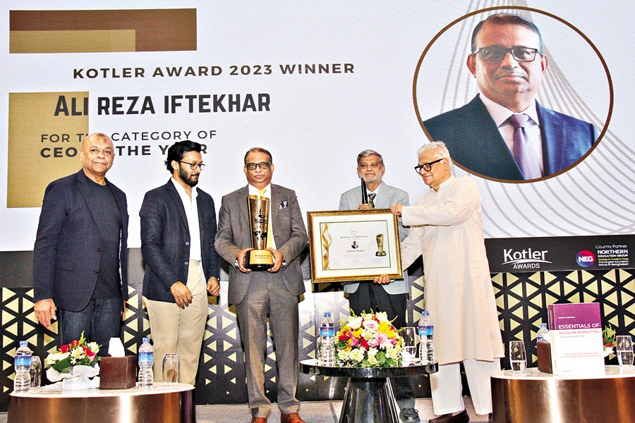 Eastern Bank MD and CEO Ali Reza Iftekhar has been awarded the Kotler CEO of the Year 2023 in Dhaka recently. The award recognises exceptional marketing campaigns and professionals who have made significant contributions to Bangladesh's marketing and business landscape. Iftekhar expressed gratitude for the recognition and credited his team for support. With 37 years of experience, Iftekhar has been EBL's CEO since 2007. He served as president of the Association of Bankers Bangladesh.