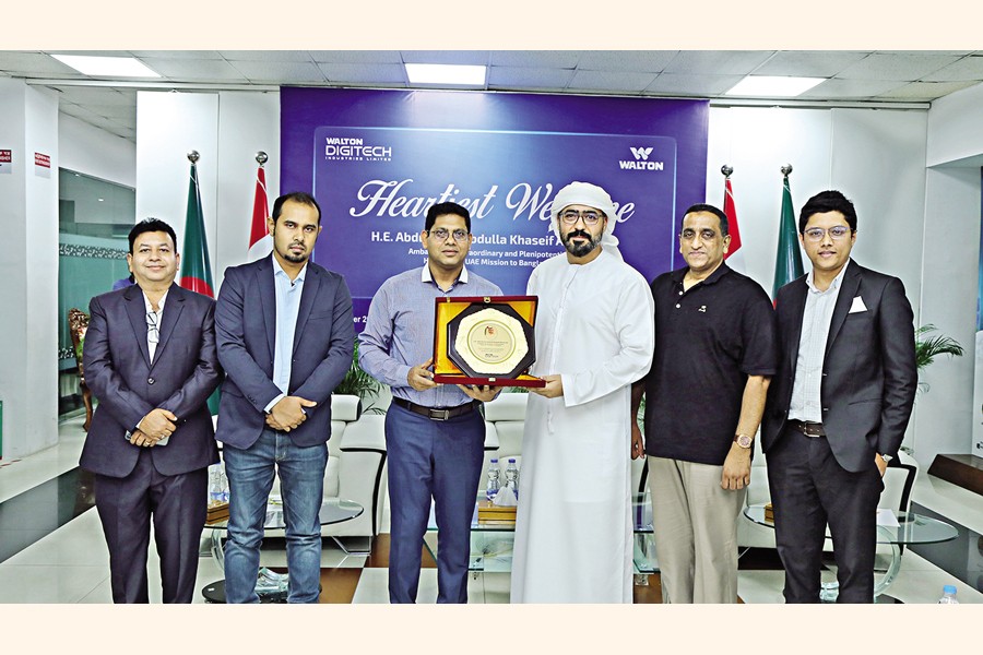 Abdulla Ali Abdulla Khaseif Al Hmoudi, ambassador of the United Arab Emirates (UAE) in Bangladesh, visited Walton Headquarters in Chandra of Gazipur recently. Walton Digi-Tech Industries Limited Chairman SM Rezaul Alam handed over a crest to the UAE Ambassador on the office premises.
