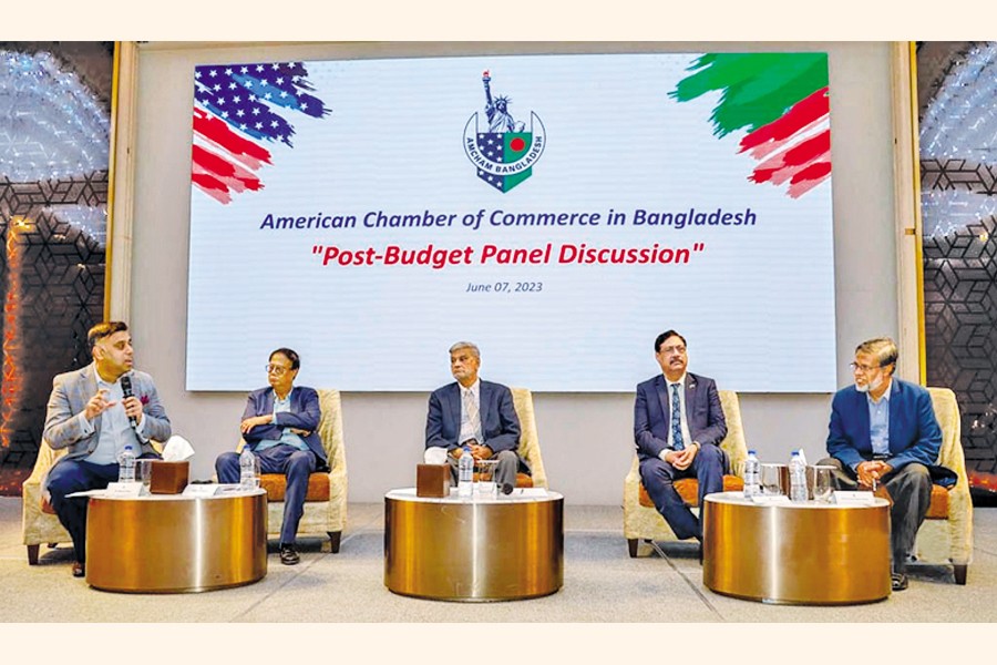 Guest speakers at a discussion on the proposed budget for FY24, organised by the American Chamber of Commerce at Hotel Sheraton, Banani in the capital.