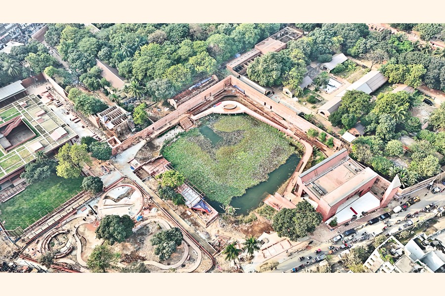 An aerial view of the Old Dhaka Central Jail on Nazimuddin Road, which is being converted into a comprehensive cultural centre. The project includes a multipurpose complex, a museum, a lake, walkways, and an extensive afforestation programme, among other facilities. The photograph was captured on Wednesday. — FE Photo by K Asad-Uz-Zaman