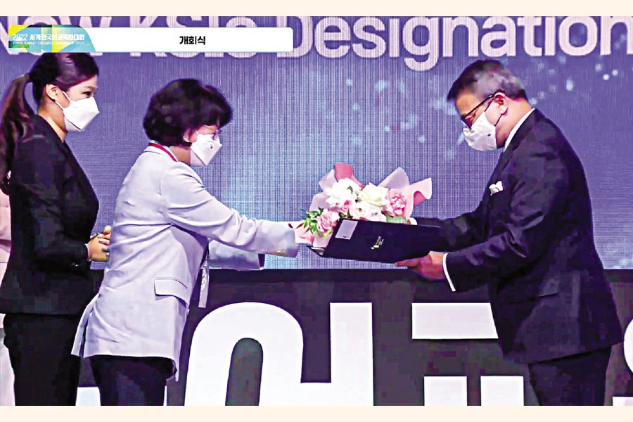 An official of The King Sejong Institute Foundation, a global language and cultural outreach centre, hands over the KSI designation certificate to Vice chancellor of Independent University, Bangladesh (IUB) Tanweer Hasan at a ceremony in the Korean capital city of Seoul recently