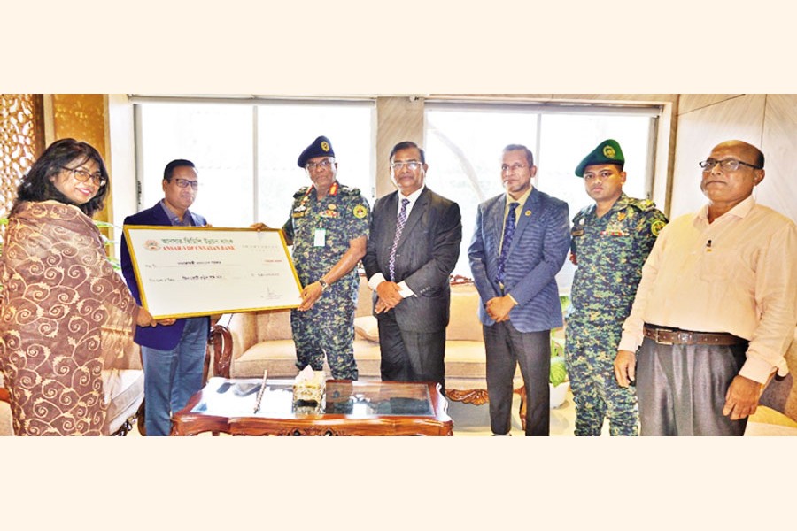 Major General AKM Nazmul Hasan, chairman of the board of directors of Ansar-VDP Unnayan Bank and Director General of Bangladesh Ansar and Village Defense Party, handed over a dividend cheque for Tk 34 million in favour of the government to Sheikh Mohammad Salim Ullah, secretary, Financial Institutions Department, Ministry of Finance, on Tuesday