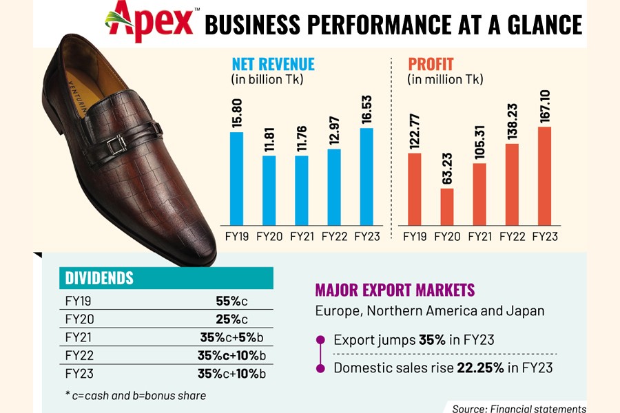 The board of directors of Apex Footwear recommended 35 per cent cash dividend and 10 per cent stock dividend for shareholders for FY23.