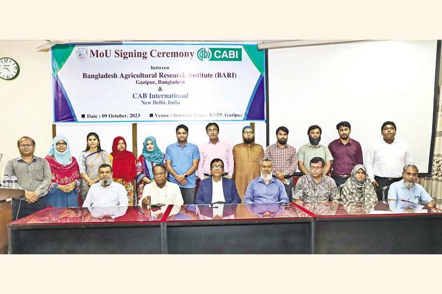 Bangladesh Agricultural Research Institute (BARI) Director General Dr Debasish Sarker and Acting Director-South Asia of Centre for Agriculture & Bioscience International (CABI) Dr Vinod Pandit signed a Memorandum of Understanding (MoU) on behalf of their respective organisationa at the BARI seminar room on Monday. Chief scientific officer of Training and Communication Wing of BARI Dr Ashraf Uddin Ahmed and chief scientific officer of Entomology Division Dr Nirmal Kumar Dutta and Regional coordinator of CABI Dr Malvika Chaudhary were present on the occasion.