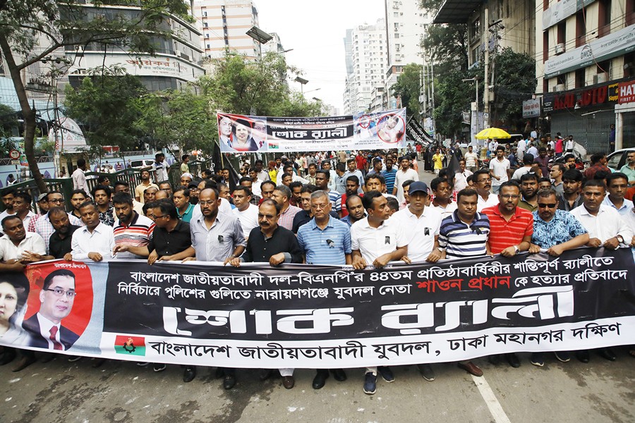 Bangladesh Jatiyatabadi Jubo Dal activists staged a rally in front of the party's Nayapaltan central office in the city on Wednesday to protest against the killing of Jubo Dal activist Shaon in Narayanganj — FE Photo