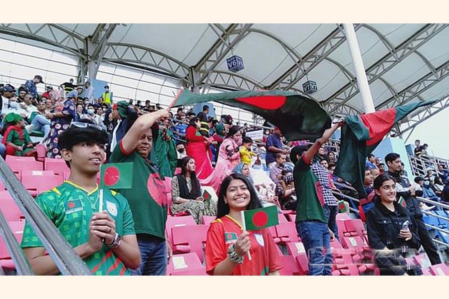 Bangladesh supporters cheer for their team during the SAFF Women's Championship final match against Nepal at Dasharath Stadium in Kathmandu on Monday — bdnews24.com
