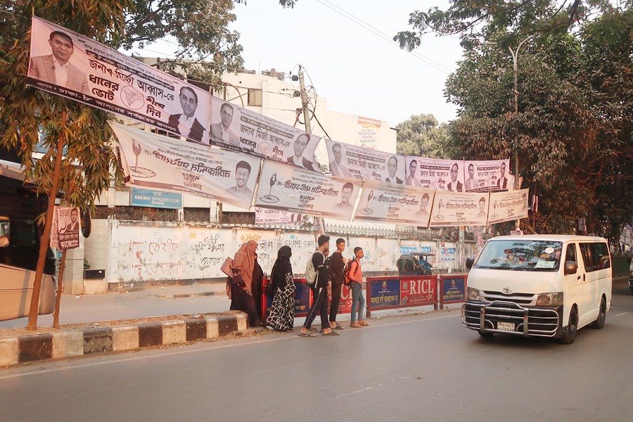 Banners of BNP’s Mirza Abbas and NCP’s Nasiruddin Patwary, Dhaka-8 candidates, hang along a Shahjahanpur road in the capital on Sunday as part of the 13th Jatiya Sangsad election campaign. — FE Photo