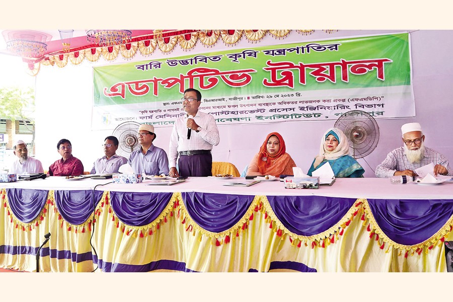 The FMPE division of Bangladesh Agricultural Research Institute (BARI) arranged an adaptive trial of farm machinery on Monday. Dr. Debasish Sarker, Director General of BARI, was present at the event as the chief guest. Dr. Ferdouse Islam, Director (Support & Services), chaired the session while Dr Md Tariqul Islam, Director (Oil Seed), Dr Dilwar Ahmed Choudhury, Director (Planning & Evaluation), Dr Sohela Akter, Director (TCRC), Dr Gobinda Chandra Biswas, Director (HRC), and Dr Md Ayub Hossain, ex-Director (T&C), were present as special guests. Dr Md Nurul Amin, PD (FMDP), delivered the welcome address.
