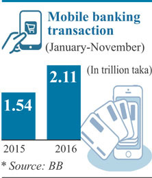 Meanwhile, country's mobile banking transactions amounted to at Tk 2.11 trillion during the first 11 months of 2016.