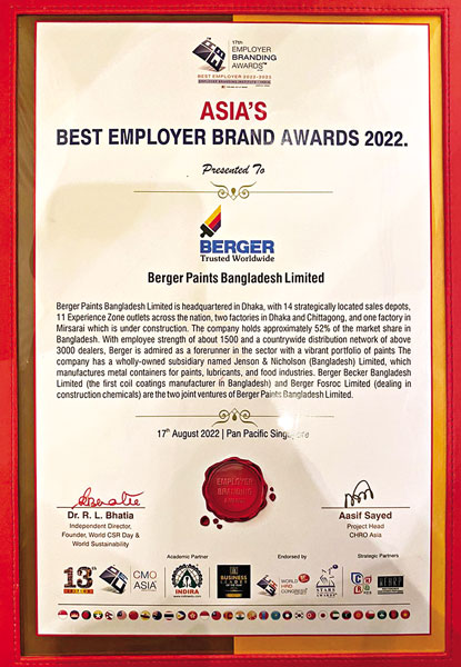Berger Paints Bangladesh Limited (BPBL) has been presented with Asia's Best Employer Brand 2022 by World HRD Congress at Singapore's Pan Pacific, Marina Square with global industry leaders and organisations. On behalf of Berger, Afrina Nazneen, Officer Culture & Employer Branding from HR Department, received the award, says a press release.