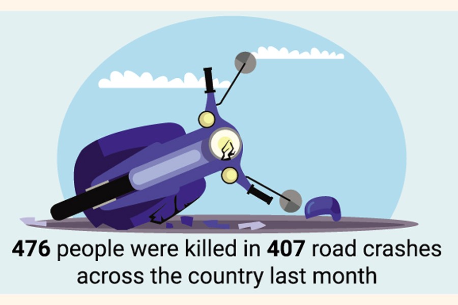 At least 476 people were killed and 794 others injured in 407 road accidents across the country during the month. Of them, 169 or 35.5 per cent were killed in 182 motorcycle accidents.