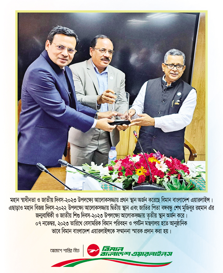 Biman Bangladesh Airlines' acting Managing Director and CEO Md. Siddikur Rahman receives prizes from Civil Aviation and Tourism Minister Md. Mahbub Ali and secretary Md. Mokammel Hossain at a function recently as the national carrier was adjudged champion among the agencies under the Civil Aviation and Tourism Ministry in illumination of their buildings and premises on the occasion of Independence and National Day-2023. Besides, it emerged 2nd and third in illumination on the occasions of Victory Day 2022 and Birthday of Father of the Nation Bangabandhu Sheikh Mujibur Rahman and the National Child Day-2023 respectively.