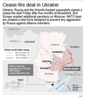 Strong explosions were heard early Sunday on the outskirts of the main rebel-held city in eastern Ukraine near the airport, raising new fears that a cease-fire signed two days ago is on the verge of collapse. Blasts powerful enough to be heard in downtown Donetsk came from the area near the airport, which has been under the control of government troops since May and has come under unremitting attacks from pro-Russia separatist rebels since then. The cease-fire had appeared to be holding for much of the day on Saturday, but shelling started late at night. A rebel statement said Ukrainian forces violated the cease-fire by firing on their positions in six locations on Saturday, including near the Donetsk airport. The statement said several rebels were killed. Witnesses said that heavy explosions were also coming from the eastern outskirts of the port city of Mariupol late Saturday, where Ukrainian troops retain defensive lines against the rebels. The city council there said one serviceman was wounded when a checkpoint was hit and the volunteer Azov Battalion said on Facebook that their positions were hit by Grad rockets, but did not give details, according to AP.