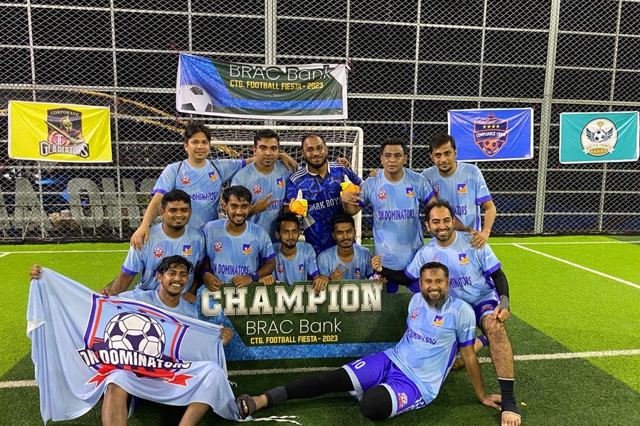 Players of DN Dominators posing after becoming champions of the 'BRAC Bank Chattogram Football Fiesta 2023' at Sicho Arena in Kalurghat area of Chattogram city recently. BRAC Bank in the Chattogram region organised the day-long inter-departmental football tournament